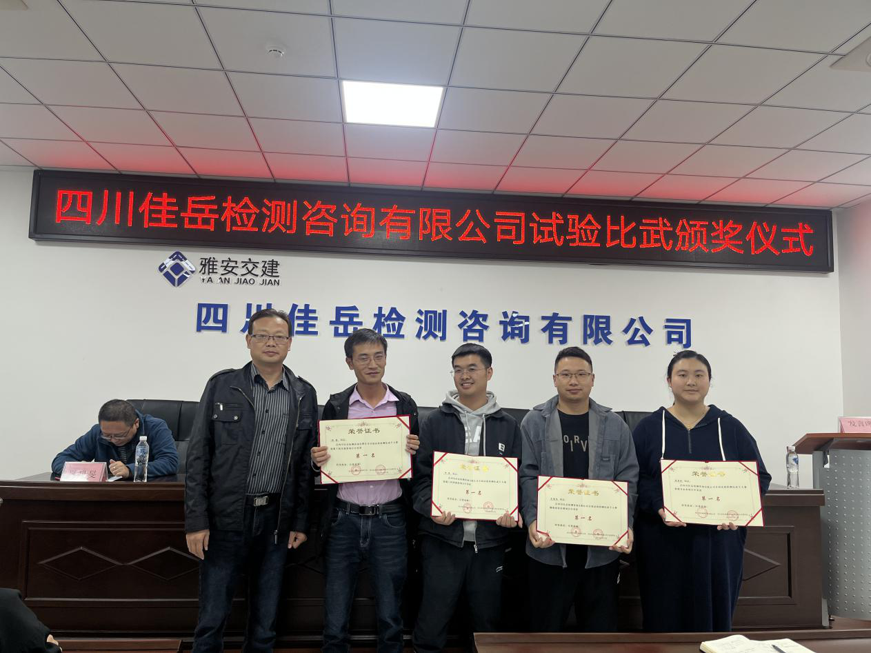 11月8日,雅安交建集團(tuán)所屬四川佳岳檢測(cè)咨詢有限公司舉行頒獎(jiǎng)典禮,對(duì)第一屆試驗(yàn)檢測(cè)技能比武大賽進(jìn)行總結(jié)和表彰。