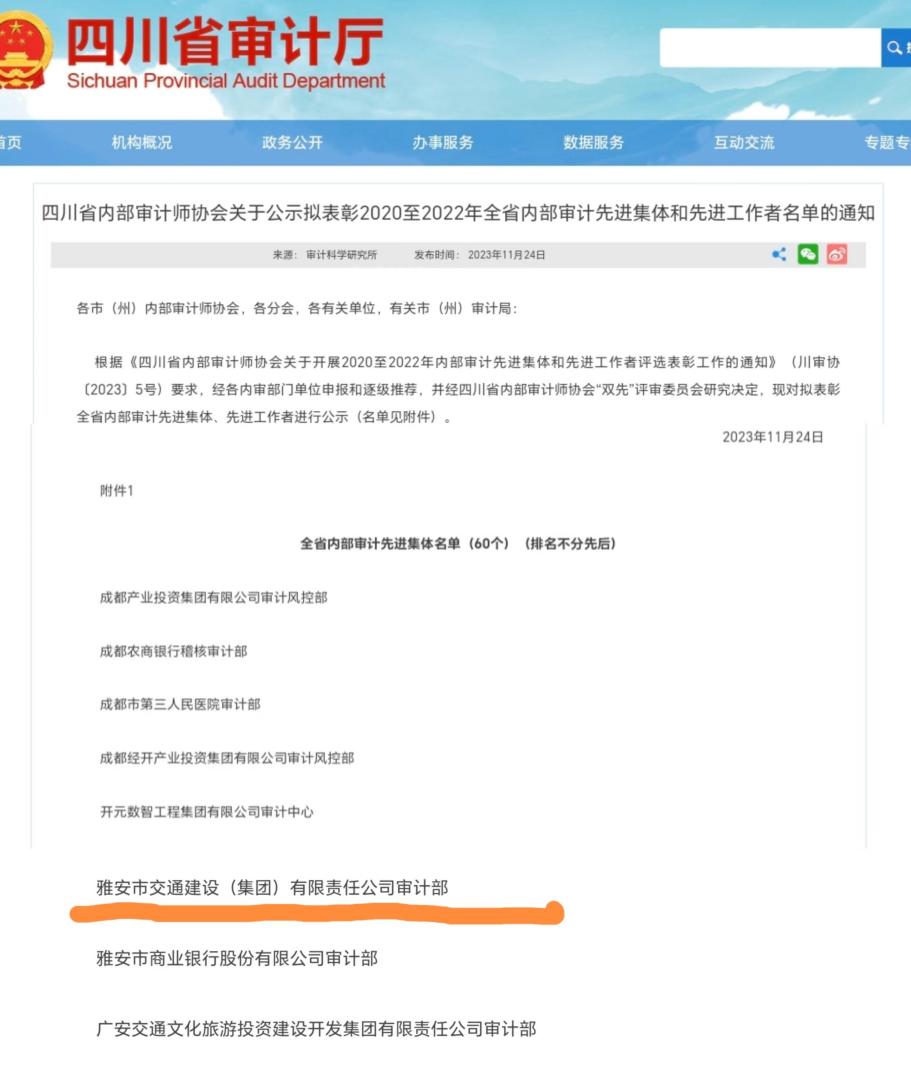 雅安交建集團黨委高度重視內(nèi)部審計工作,公司成立獨立內(nèi)審機構,由集團黨委書記、董事長直接分管,按照內(nèi)審計劃和黨委、董事會安排,獨立開展工作,并定期向黨委、董事會匯報內(nèi)審工作開展情況。近年來,公司已建立《內(nèi)部審計工作管理辦法》《經(jīng)濟責任審計實施細則》等內(nèi)部審計制度,通過全面審計、專項審計和“1+N”內(nèi)部監(jiān)督檢查工作機制,規(guī)范集團及子公司制度建設,提升管理水平,助力集團創(chuàng)建“千億國企,品質(zhì)交建”。