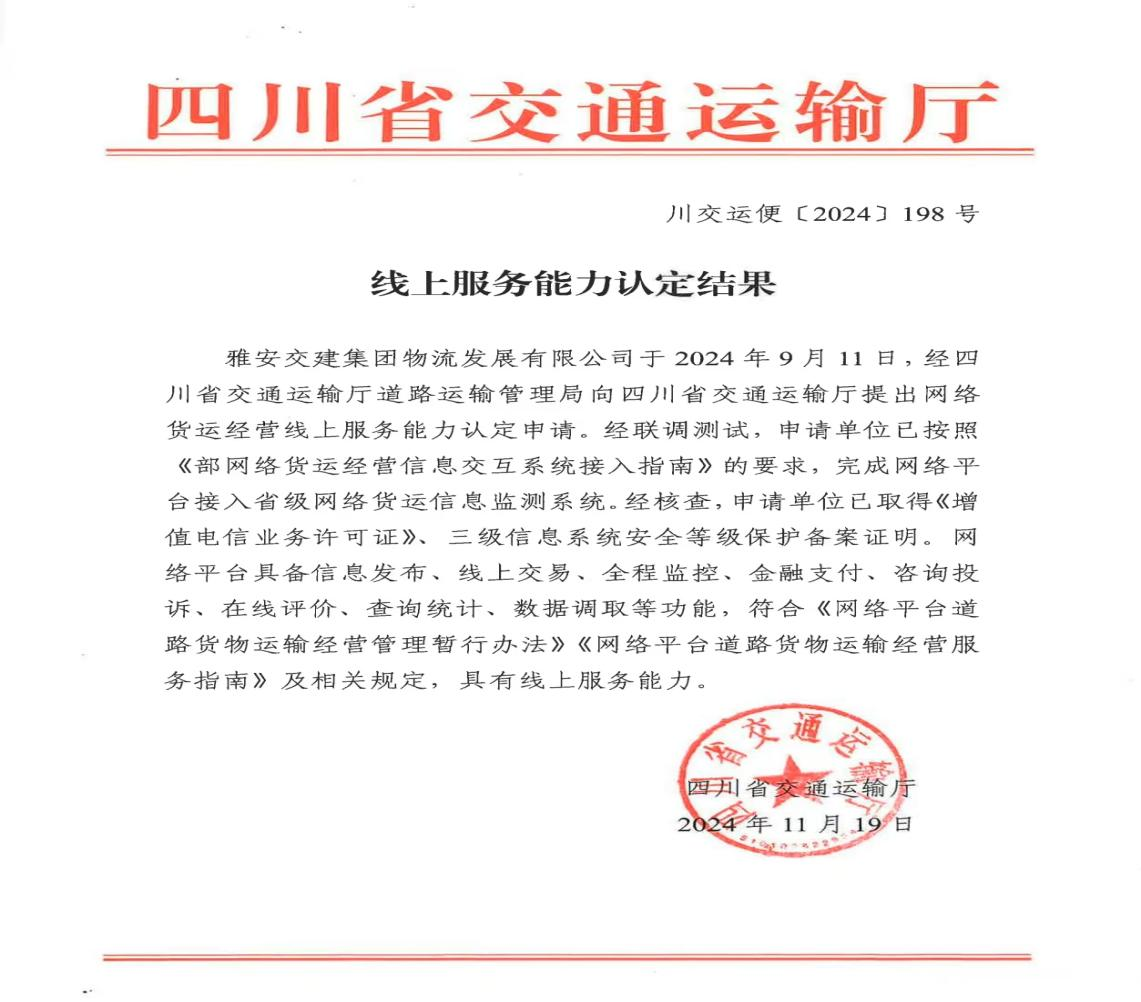 近日,《四川省交通運輸廳線上服務(wù)能力認定結(jié)果》發(fā)布,雅安交建集團物流發(fā)展有限公司正式取得網(wǎng)絡(luò)貨運經(jīng)營線上服務(wù)能力認定,標(biāo)志著雅安首家國企網(wǎng)絡(luò)貨運平臺即將面向市場運營。