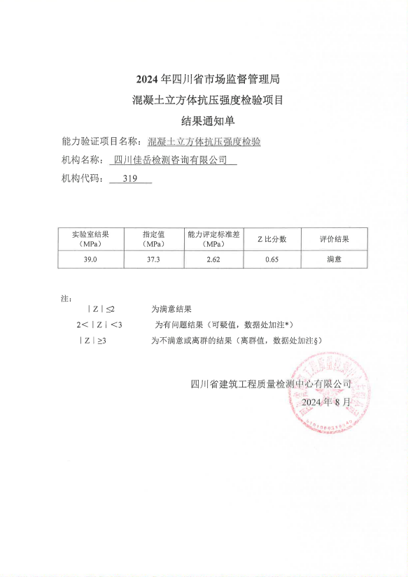 喜訊!四川佳岳檢測咨詢有限公司(簡稱:佳岳公司)在2024年度四川省市場監(jiān)督管理局組織的檢驗檢測機構(gòu)能力驗證項目中,參與的“混凝土立方體抗壓強度檢驗”項目獲得“滿意”評價。