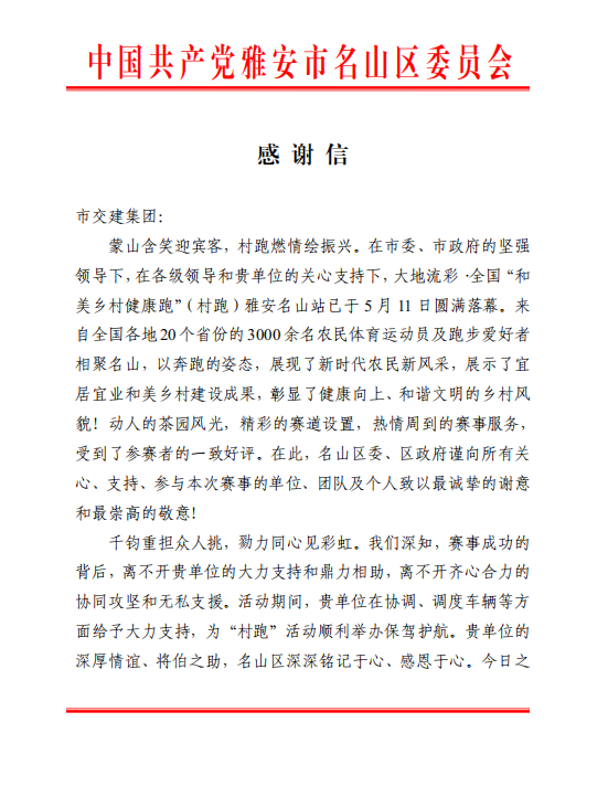 5月10日至11日,以“心向和美 逐夢茶源”為主題的大地流彩·2025年全國和美鄉(xiāng)村健康跑(村跑)雅安名山站活動(dòng)在雅安市名山區(qū)成功舉辦。四川蜀通運(yùn)業(yè)有限責(zé)任公司作為運(yùn)輸保障單位,圓滿完成賽事期間各項(xiàng)運(yùn)輸保障任務(wù),為活動(dòng)的順利開展提供了堅(jiān)實(shí)保障,受到名山區(qū)委、區(qū)政府感謝信。