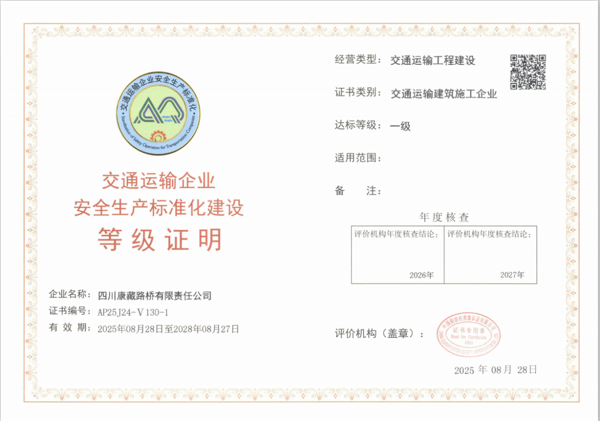 近日,經(jīng)交通運(yùn)輸部交通運(yùn)輸企業(yè)安全生產(chǎn)標(biāo)準(zhǔn)化評(píng)價(jià)機(jī)構(gòu)綜合評(píng)定,康藏路橋公司獲評(píng)安全標(biāo)準(zhǔn)化一級(jí)企業(yè)并取得證書(shū),標(biāo)志其安全生產(chǎn)管理體系獲國(guó)家最高標(biāo)準(zhǔn)認(rèn)可。