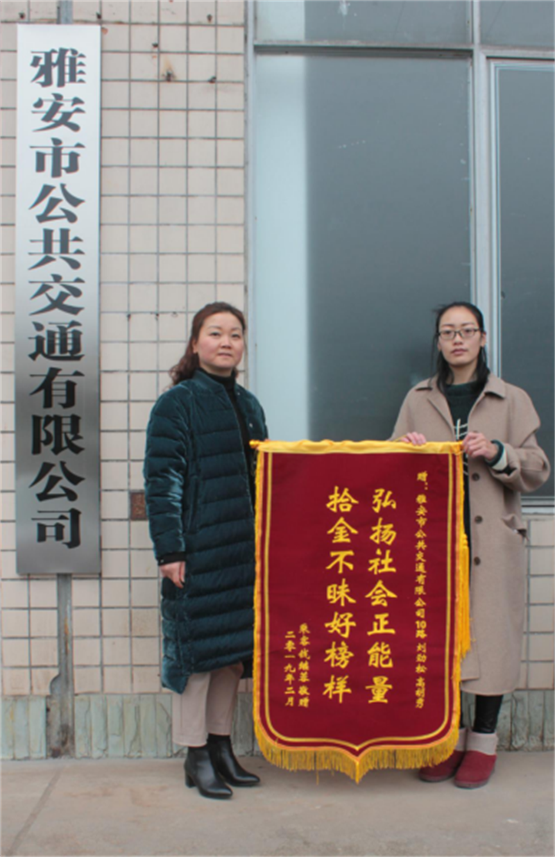 “請一定把我們的感謝帶給駕駛員和發(fā)班員!2月14日下午17時15分左右,一名手拿寫著“拾金不昧好榜樣弘揚社會正能量”錦旗的市民錢續(xù)露來到雅安市公共交通有限公司,將錦旗送到了經(jīng)理助理方媛手上,請她把感謝之意轉(zhuǎn)達(dá)給10路公交車駕駛員劉進(jìn)松和發(fā)班員高胡秀。