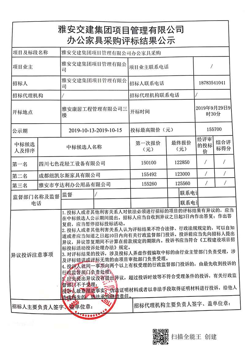 雅安交建集團(tuán)項(xiàng)目管理有限公司辦公家具采購評(píng)標(biāo)結(jié)果公示