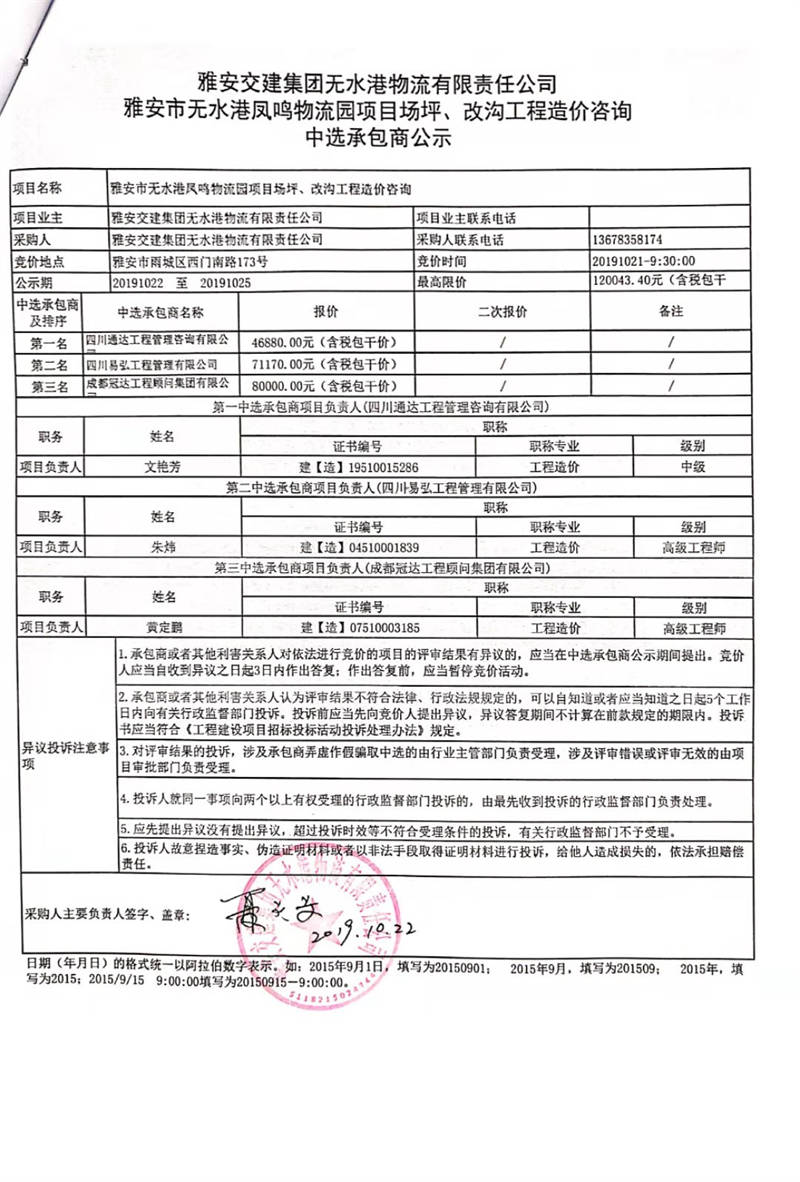 雅安交建集團(tuán)無水港物流有限責(zé)任公司雅安市無水港鳳鳴物流園項目場坪、改溝工程造價咨詢中選承包商公示