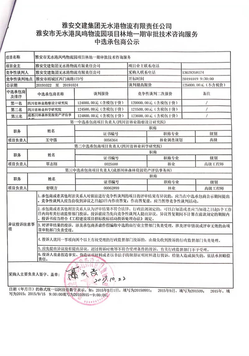 雅安交建集團(tuán)無水港物流有限責(zé)任公司雅安市無水港鳳鳴物流園項(xiàng)目林地一期審批技術(shù)咨詢服務(wù)中選承包商公示