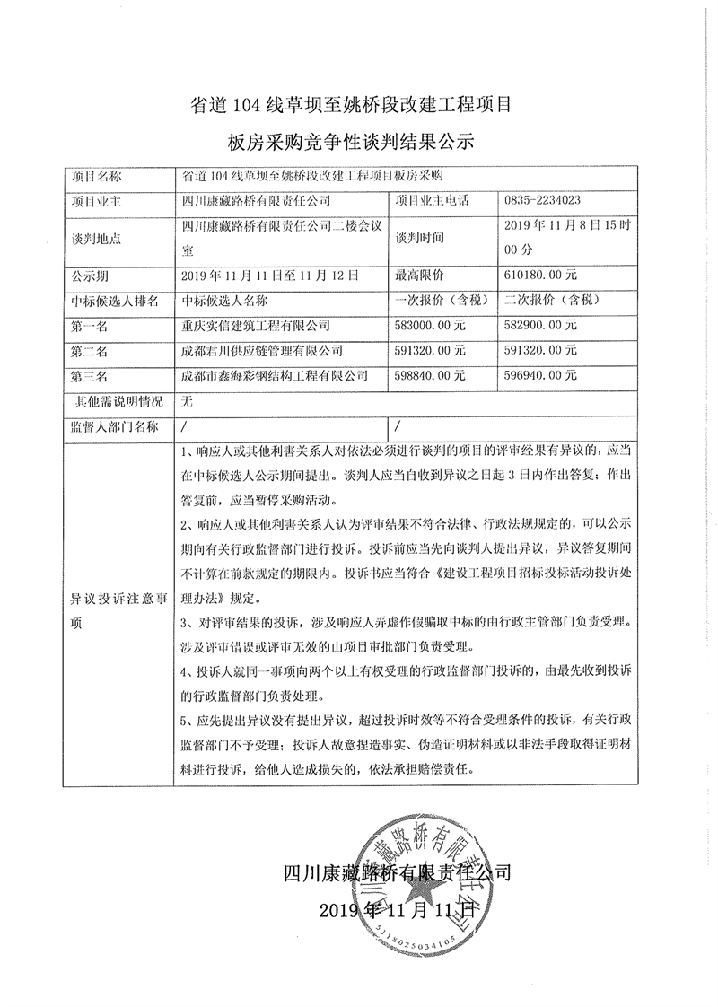 四川康藏路橋有限責任公司省道104線草壩至姚橋段改建工程項目板房采購競爭性談判結果公示