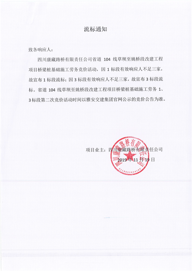四川康藏路橋有限責(zé)任公司省道104線草壩至姚橋段改建工程項(xiàng)目橋梁樁基礎(chǔ)施工勞務(wù)競(jìng)價(jià)(1標(biāo)段、3標(biāo)段)流標(biāo)通知