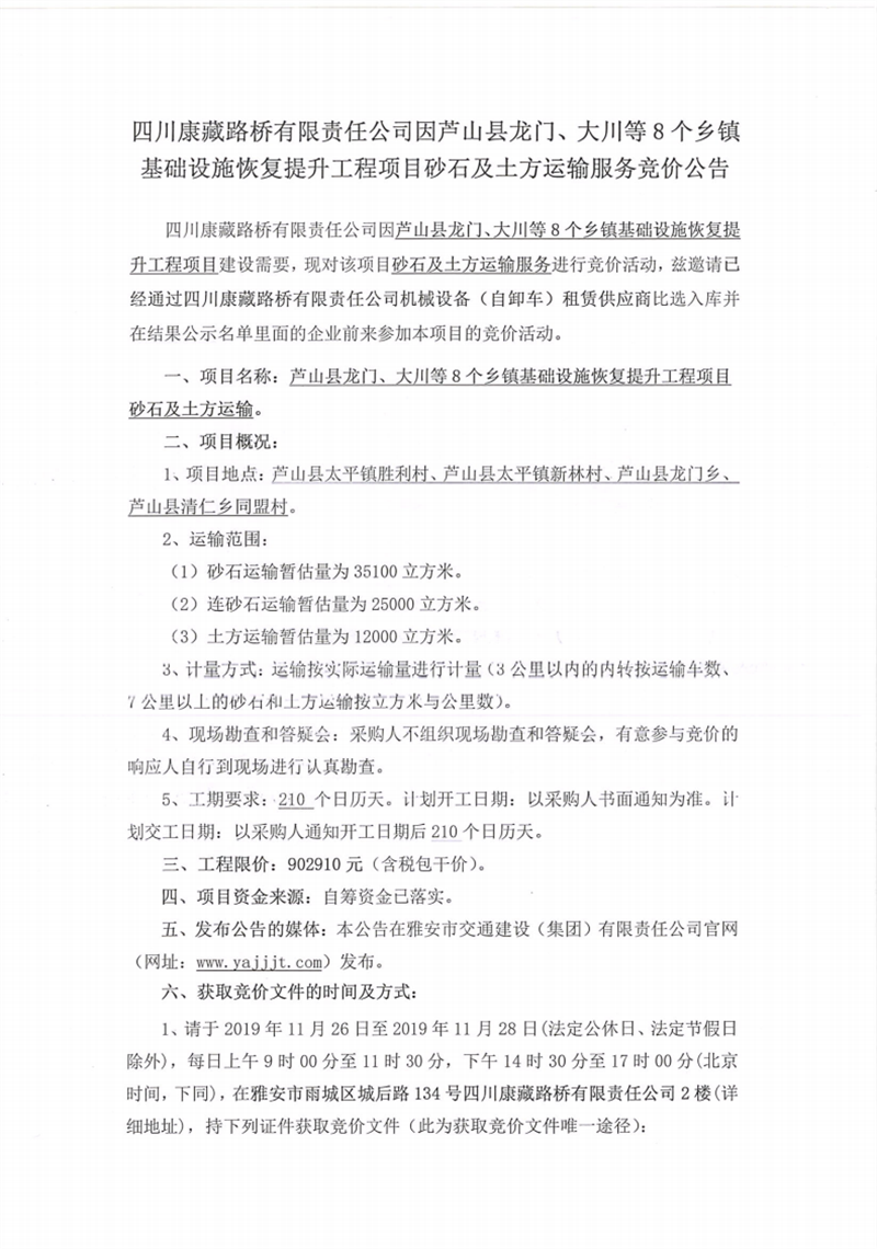 四川康藏路橋有限責任公司蘆山縣龍門、大川等8個鄉(xiāng)鎮(zhèn)基礎設施恢復提升工程項目砂石及土方運輸服務競價公告