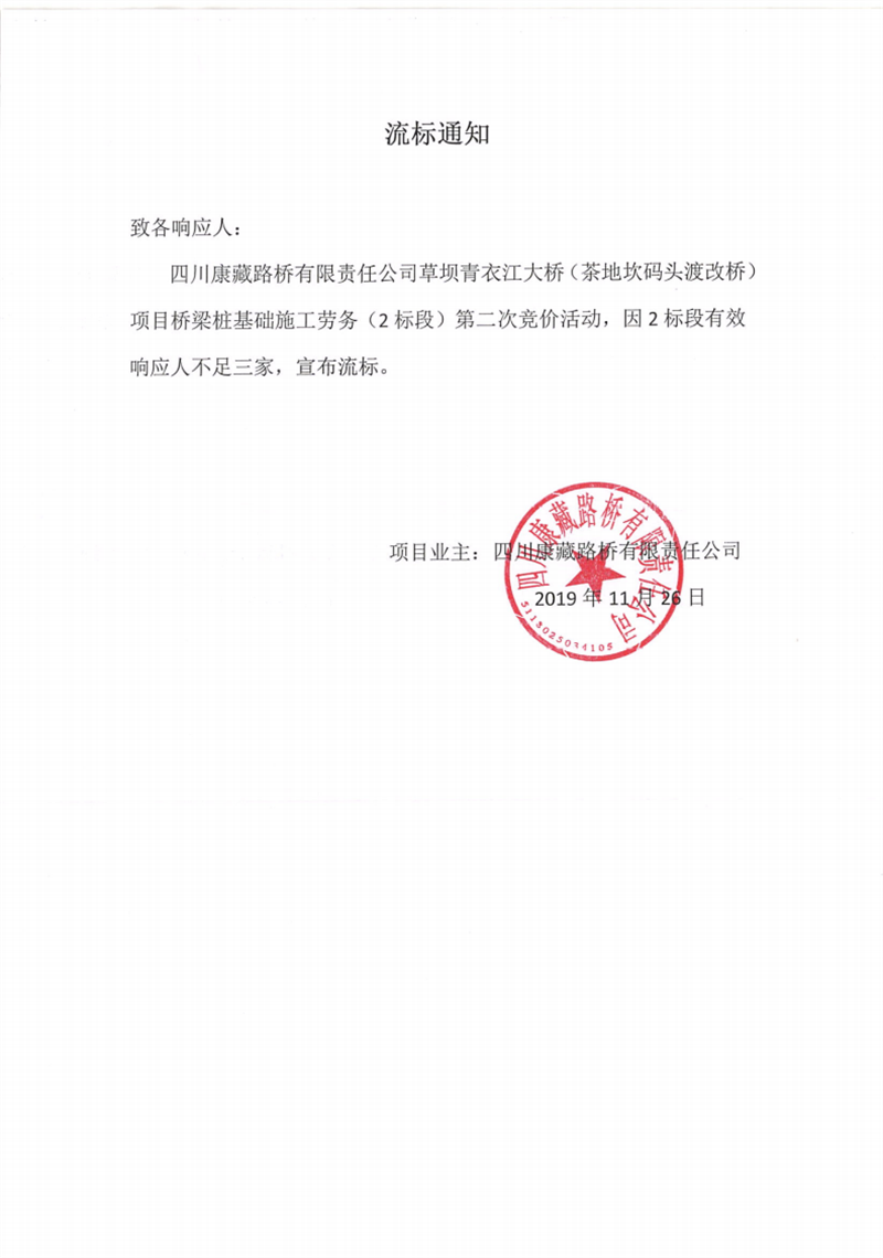四川康藏路橋有限責任公司草壩青衣江大橋(茶地坎碼頭渡改橋)項目橋梁樁基礎(2標段)施工勞務競價(第二次)流標通知