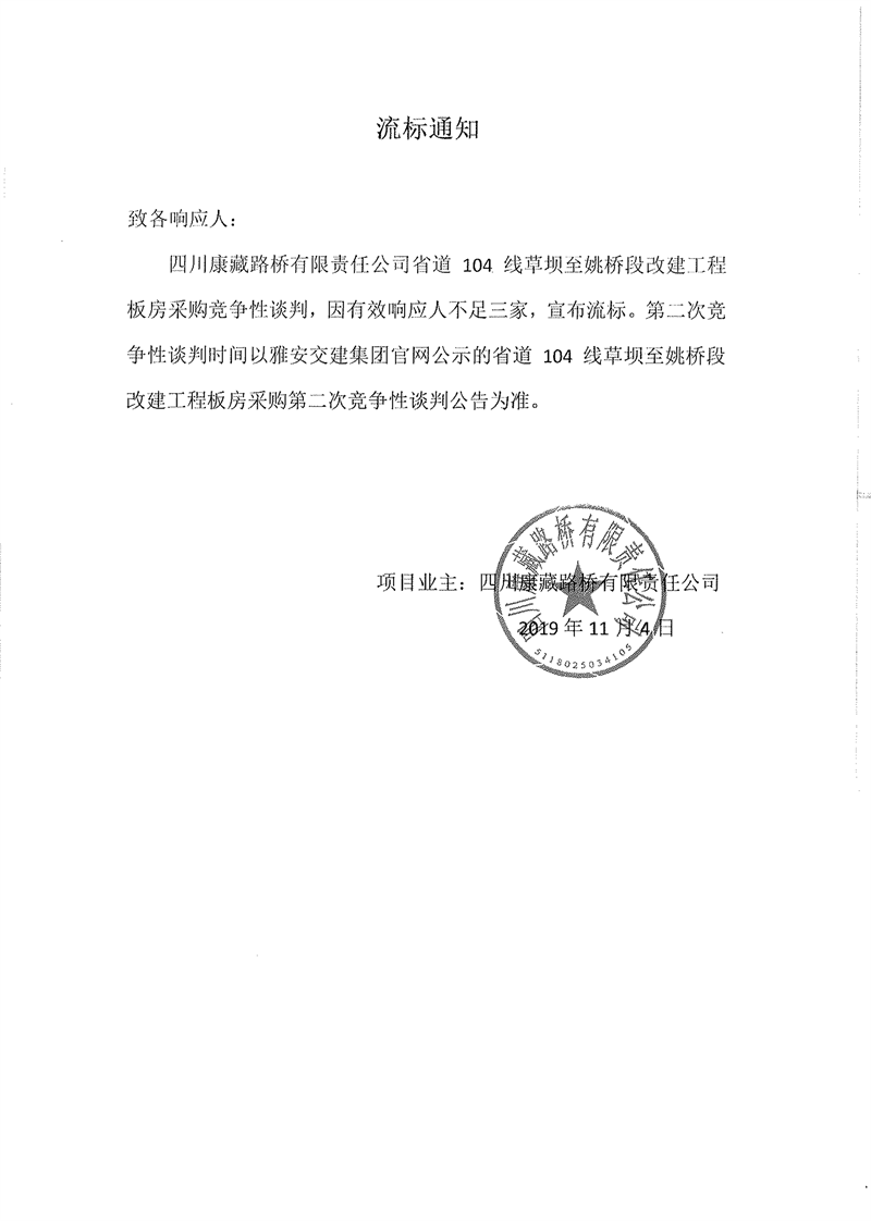 四川康藏路橋有限責(zé)任公司省道104線草壩至姚橋段改建工程板房采購(gòu)項(xiàng)目流標(biāo)通知
