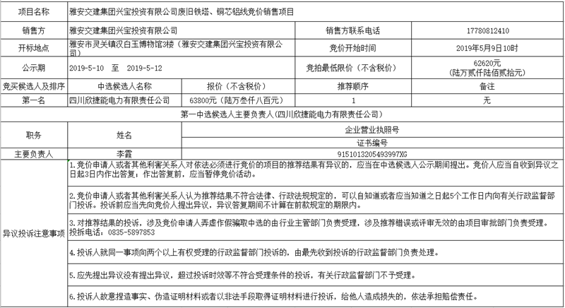 雅安交建集團(tuán)興寶投資有限公司廢舊鐵塔、銅芯鋁線競價銷售項目公示