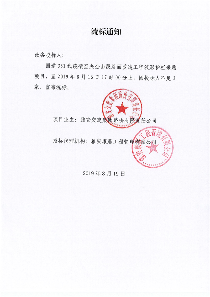 雅安交建集團路橋有限責(zé)任公司國道351線磽磧至夾金山段路面改造工程波形護欄采購項目流標通知
