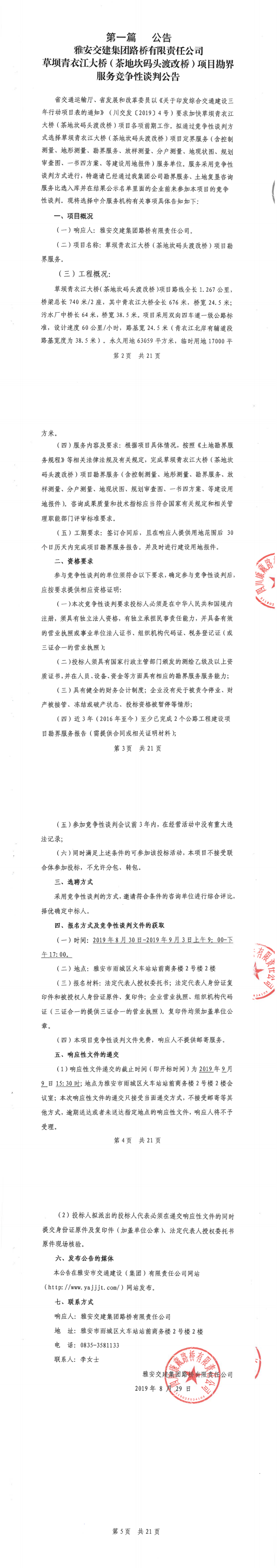 雅安交建集團路橋有限責(zé)任公司草壩青衣江大橋(茶地坎碼頭渡改橋)項目勘界服務(wù)競爭性談判公告