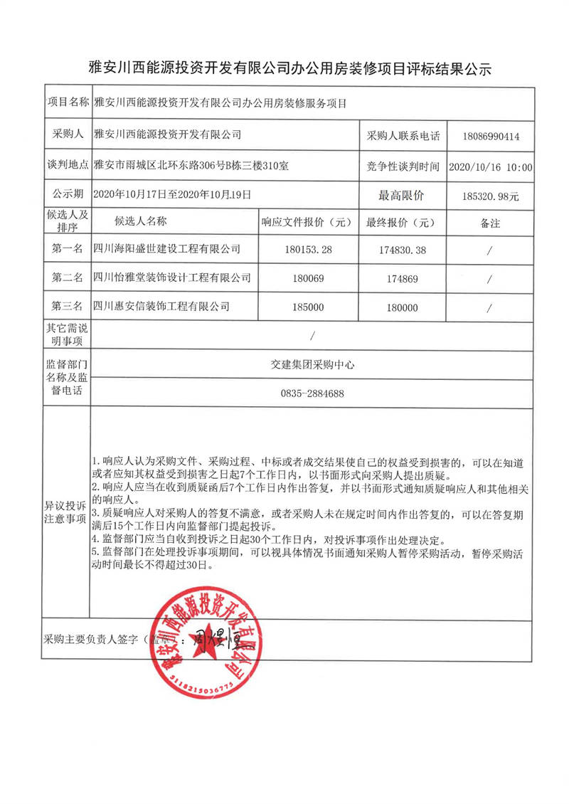 雅安川西能源投資開發(fā)有限公司辦公用房裝修項目評標結(jié)果公示