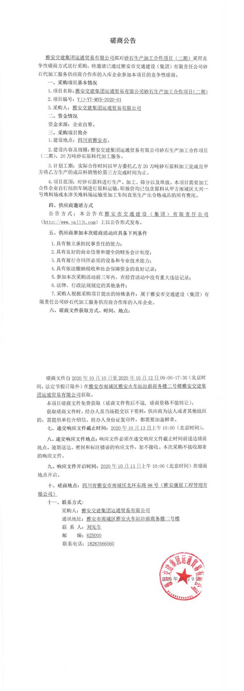 雅安交建集團(tuán)運通貿(mào)易有限公司砂石生產(chǎn)加工合作項目(二期)競爭性磋商公告