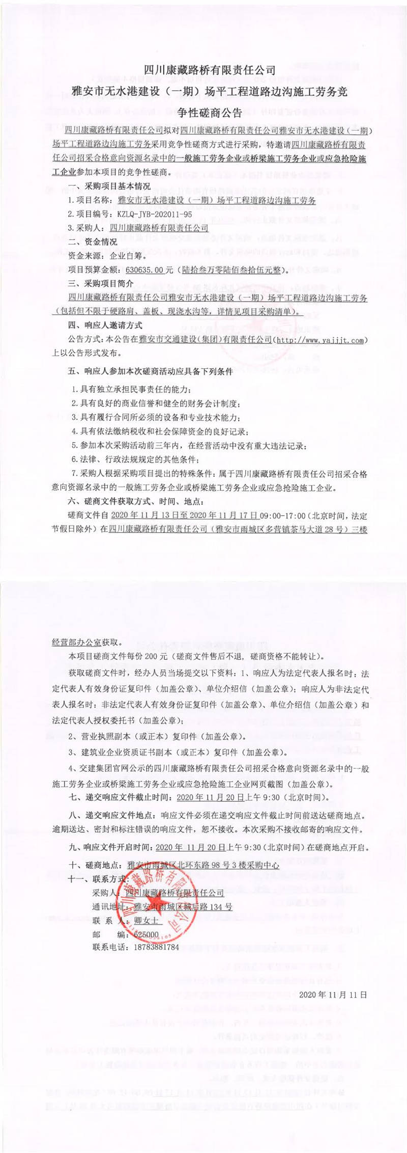 四川康藏路橋有限責(zé)任公司雅安市無(wú)水港建設(shè)(一期)場(chǎng)平工程道路邊溝施工勞務(wù)競(jìng)爭(zhēng)性磋商公告