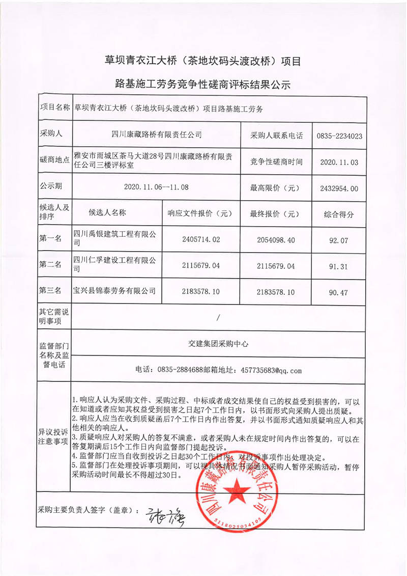 四川康藏路橋有限責任公司草壩青衣江大橋(茶地坎碼頭渡改橋)項目路基施工勞務競爭性磋商評標結果公示