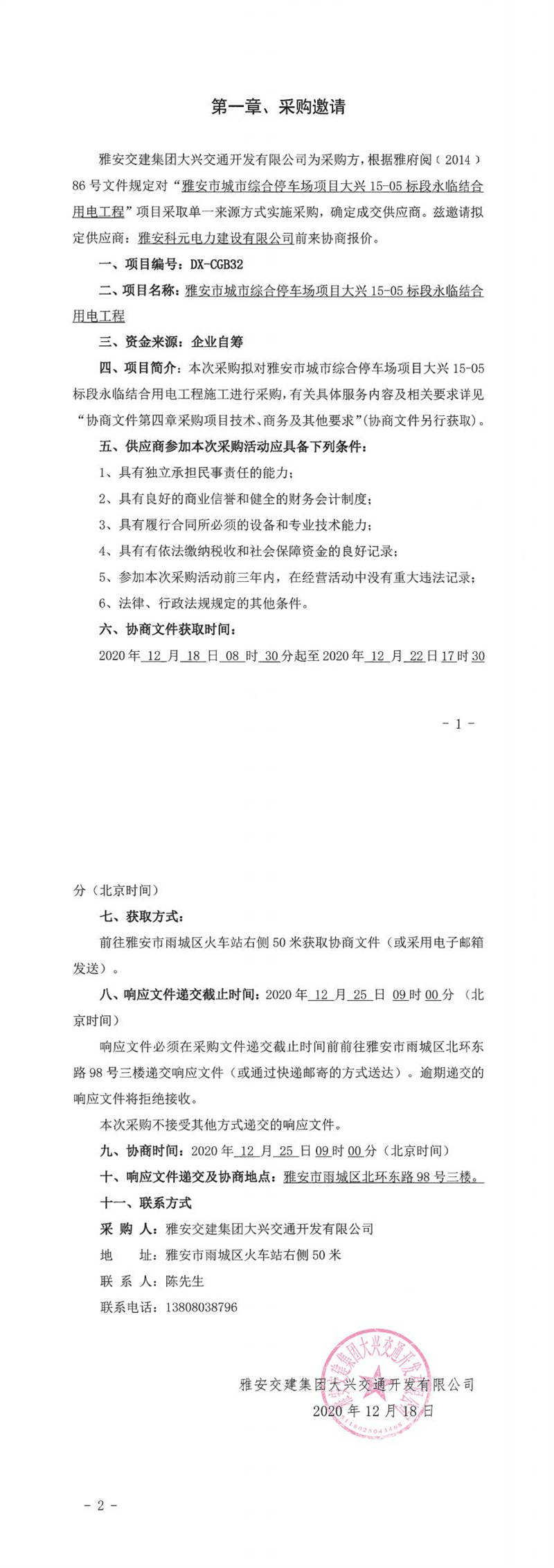 雅安交建集團(tuán)大興交通開(kāi)發(fā)有限公司雅安市城市綜合停車(chē)場(chǎng)項(xiàng)目大興15-05標(biāo)段永臨結(jié)合用電工程單一來(lái)源采購(gòu)邀請(qǐng)