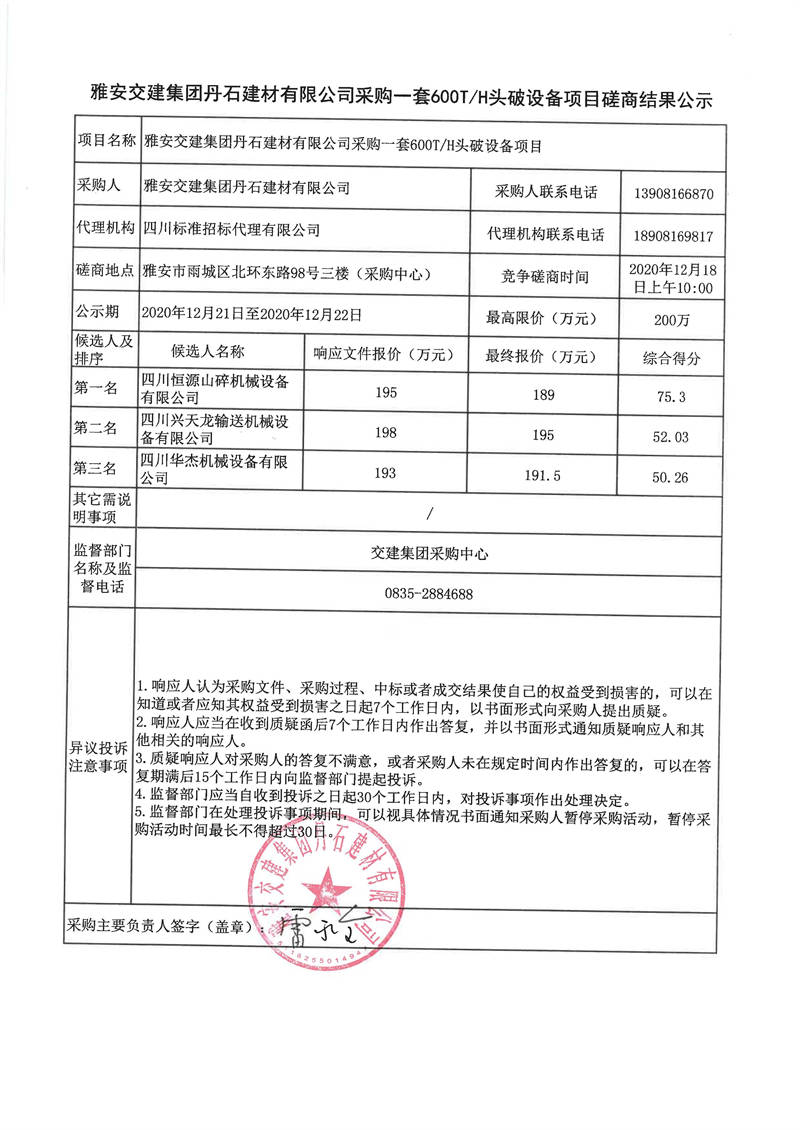 雅安交建集團(tuán)丹石建材有限公司采購(gòu)一套600T/H頭破設(shè)備項(xiàng)目磋商結(jié)果公示