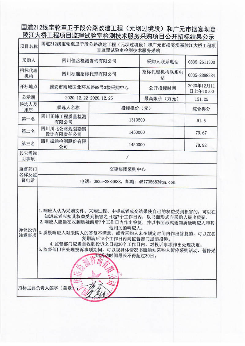 四川佳岳檢測(cè)咨詢有限公司國(guó)道212線寶輪至衛(wèi)子段公路改建工程(元壩過境段)和廣元市擺宴壩嘉陵江大橋工程項(xiàng)目監(jiān)理試驗(yàn)室檢測(cè)技術(shù)服務(wù)采購(gòu)項(xiàng)目公開招標(biāo)結(jié)果公示