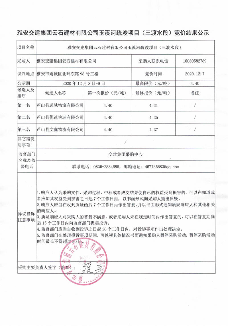 雅安交建集團云石建材有限公司玉溪河疏浚項目(三渡水段)競價結果公示
