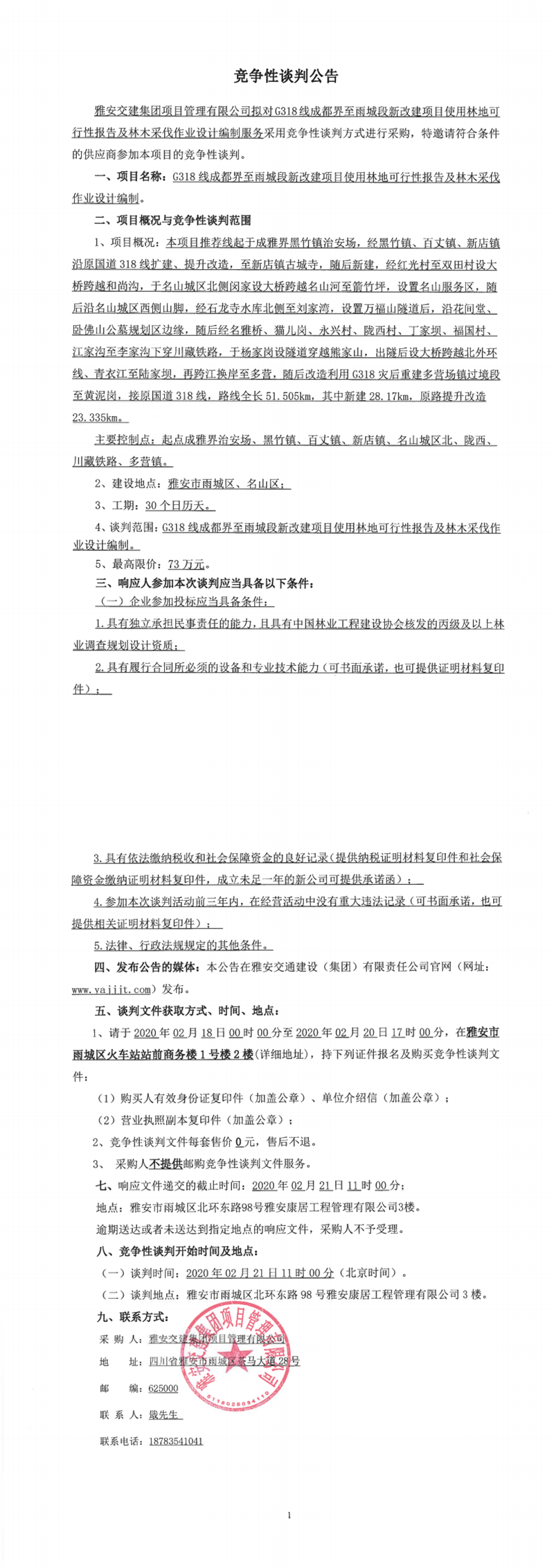 雅安交建集團(tuán)項目管理有限公司G318線成都界至雨城段新改建項目使用林地可行性報告及林木采伐作業(yè)設(shè)計編制競爭性談判公告