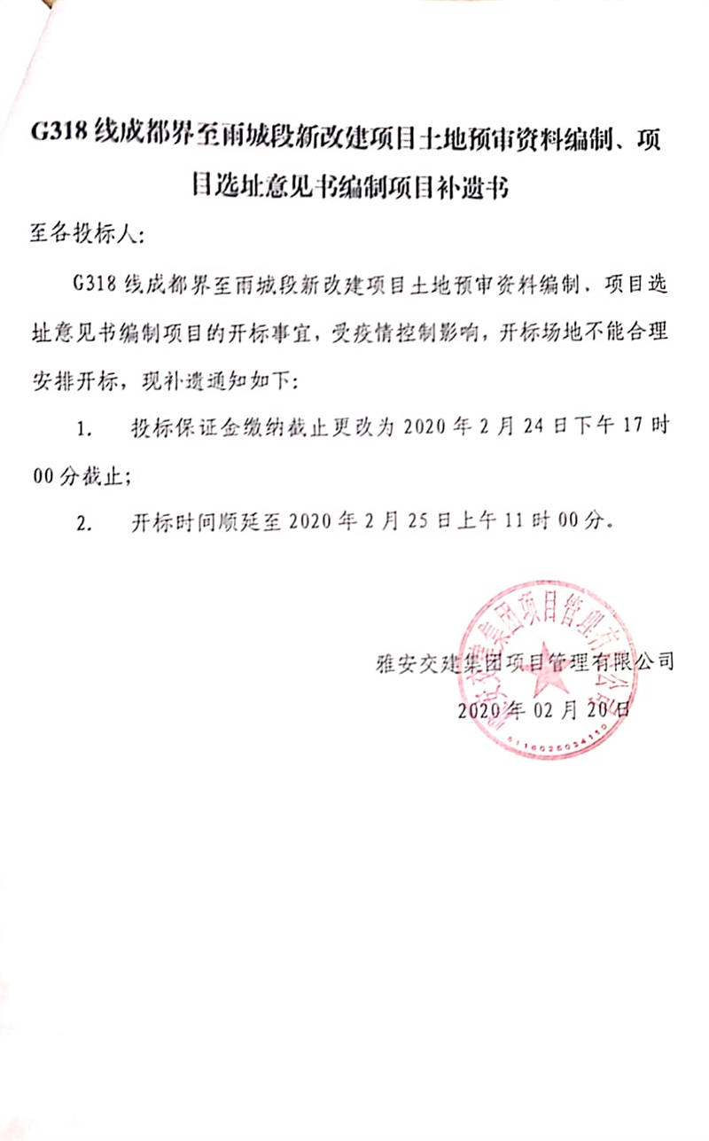 雅安交建集團(tuán)項(xiàng)目管理有限公司G318線成都界至雨城段新改建項(xiàng)目土地預(yù)審資料編制、項(xiàng)目選址意見(jiàn)書(shū)編制項(xiàng)目補(bǔ)遺書(shū)