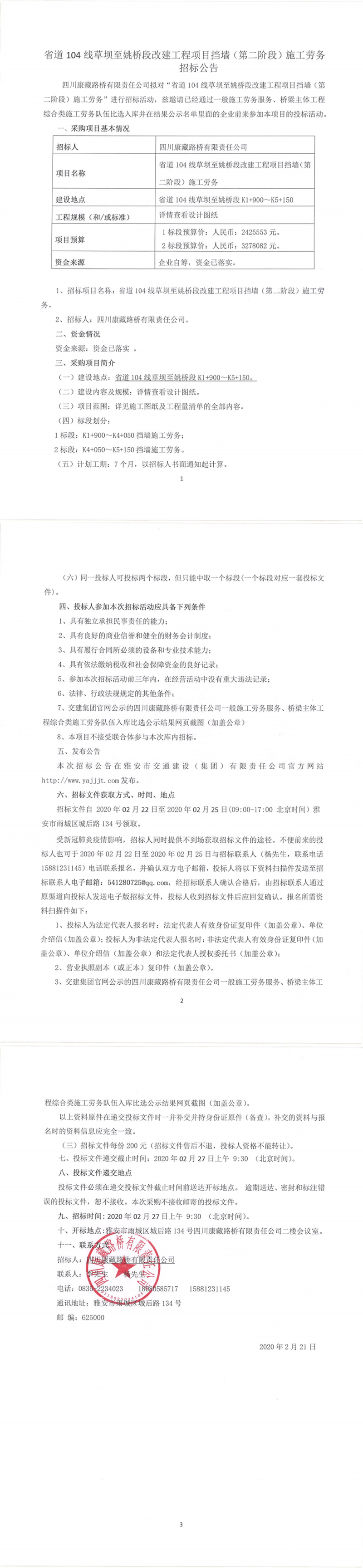 四川康藏路橋有限責任公司省道104線草壩至姚橋段改建工程項目擋墻(第二階段)施工勞務招標公告