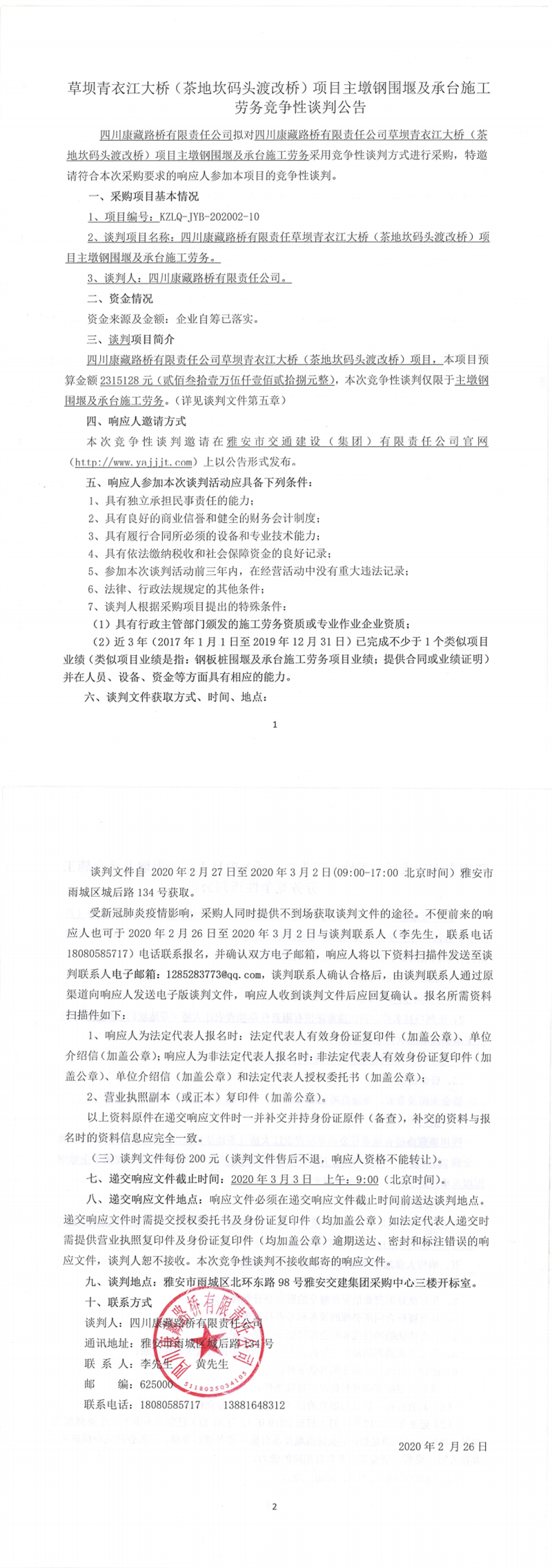 四川康藏路橋有限責(zé)任公司草壩青衣江大橋(茶地坎碼頭渡改橋)項(xiàng)目主墩鋼圍堰及承臺施工勞務(wù)競爭性談判公告