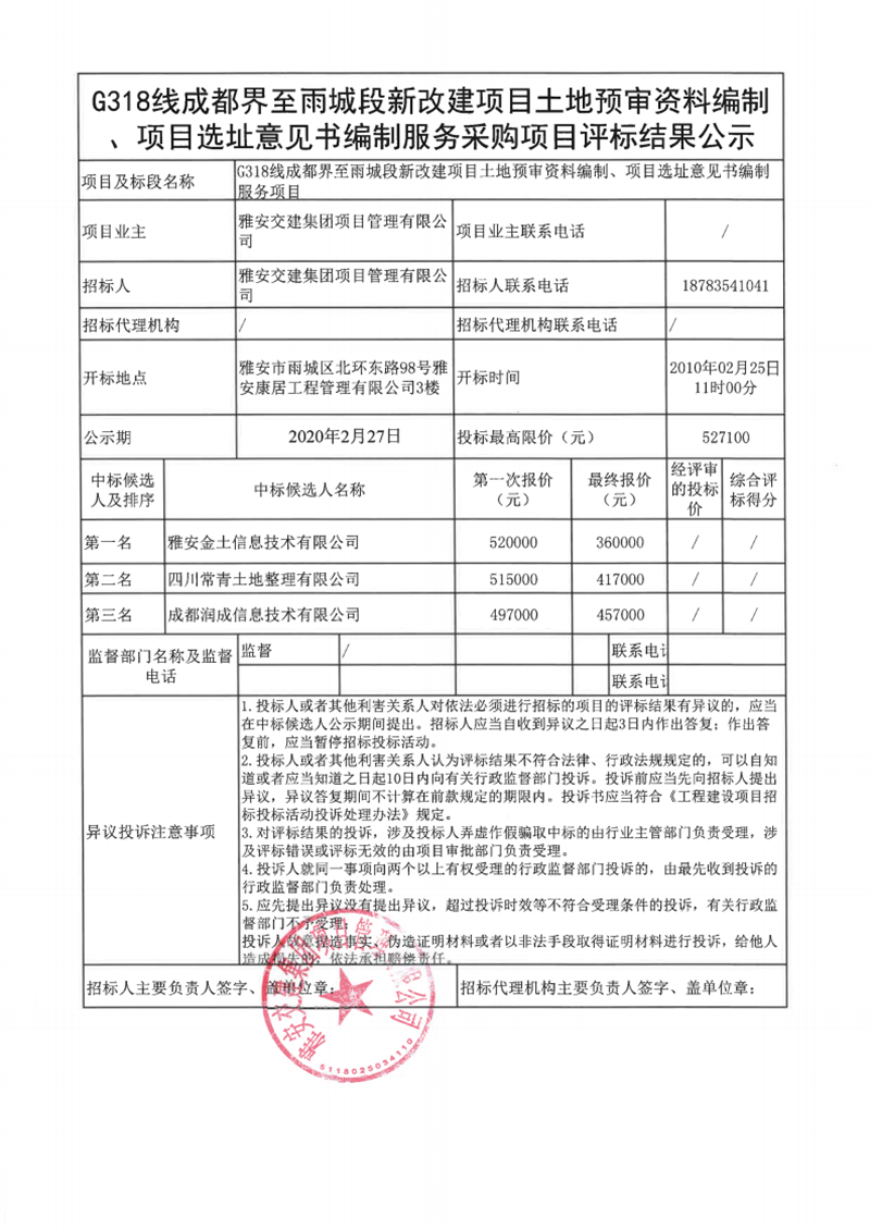 雅安交建集團項目管理有限公司G318線成都界至雨城段新改建項目土地預(yù)審資料編制、項目選址意見書編制服務(wù)采購項目評標(biāo)結(jié)果公示
