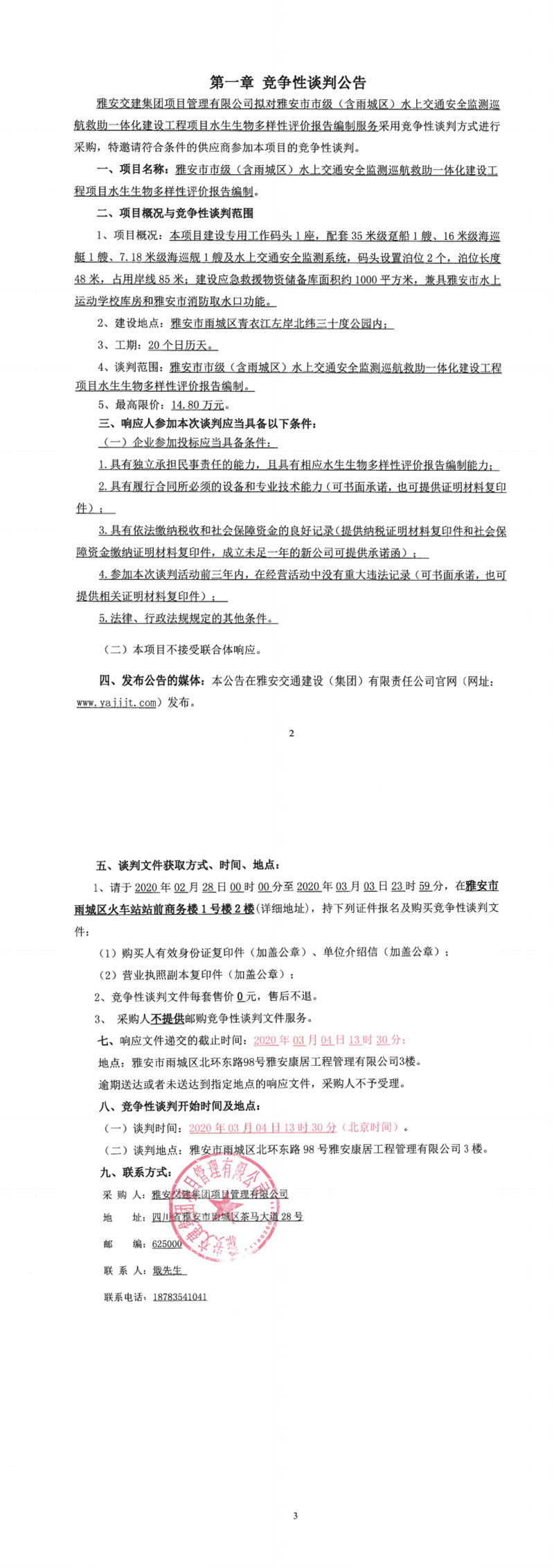 雅安交建集團項目管理有限公司雅安市市級(含雨城區(qū))水上交通安全監(jiān)測巡航救助一體化建設(shè)工程項目水生生物多樣性評價報告編制競爭性談判公告