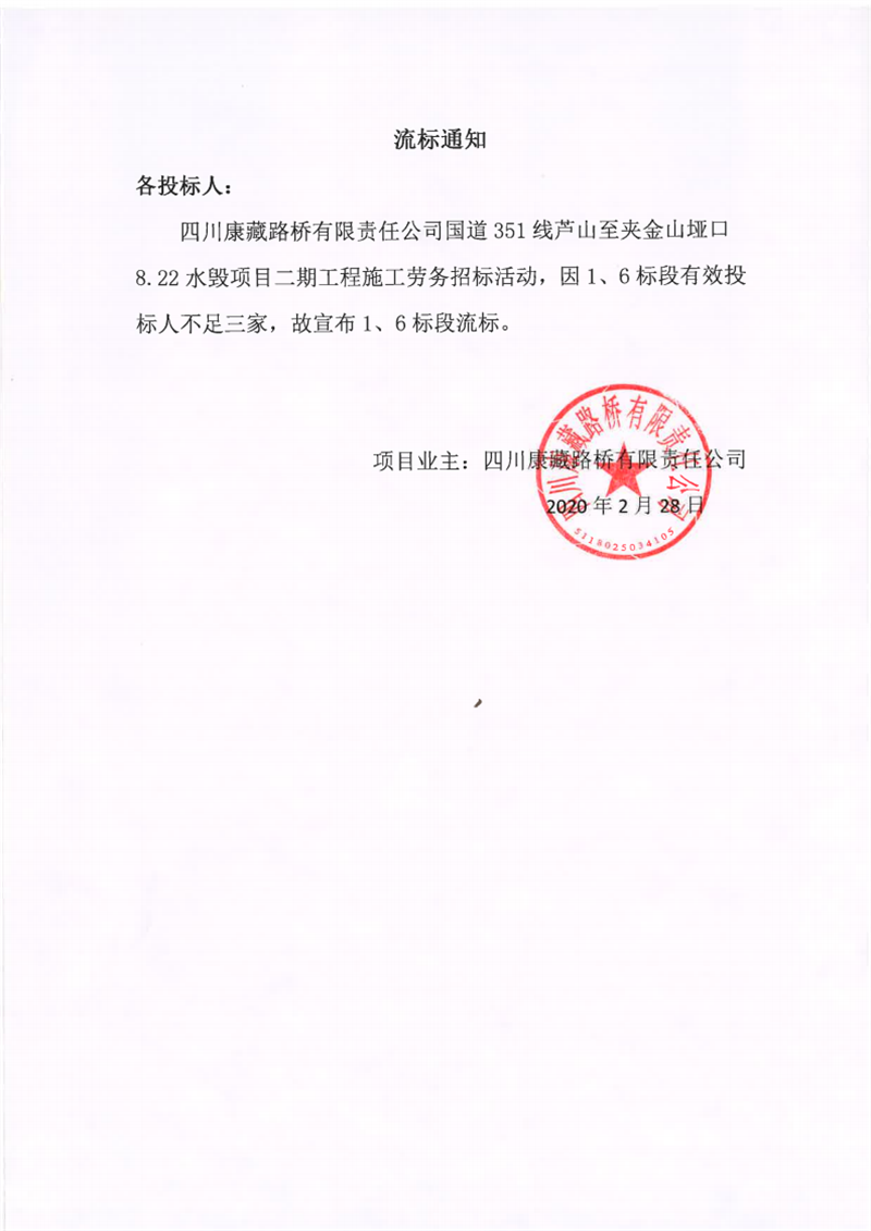 四川康藏路橋有限責(zé)任公司國(guó)道351線(xiàn)蘆山至夾金山埡口8.22水毀項(xiàng)目二期工程施工勞務(wù)(1標(biāo)段、6標(biāo)段)流標(biāo)通知