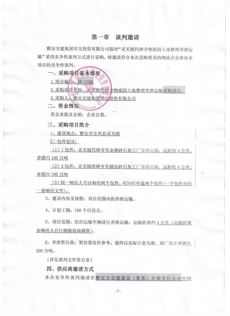雅安交建集團(tuán)興寶投資有限公司靈關(guān)鎮(zhèn)代碑寺物流園土地整理?xiàng)壴\(yùn)輸采購項(xiàng)目競爭性談判公告
