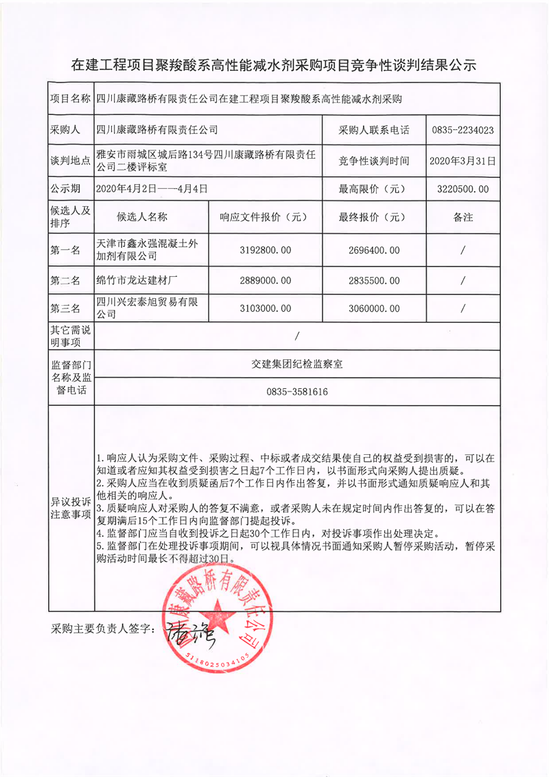 四川康藏路橋有限責(zé)任公司在建工程項目聚羧酸系高性能減水劑采購項目競爭性談判結(jié)果公示
