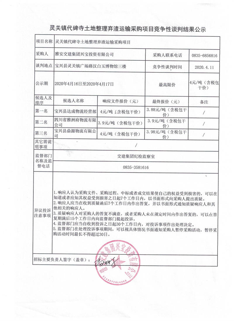 雅安交建集團(tuán)興寶投資有限公司靈關(guān)鎮(zhèn)代碑寺土地整理?xiàng)壴\(yùn)輸采購項(xiàng)目競爭性談判結(jié)果公示