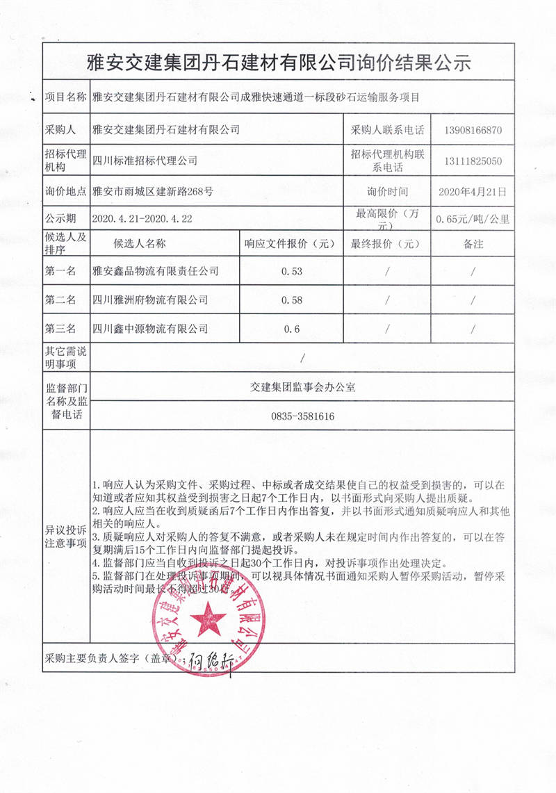 雅安交建集團丹石建材有限公司成雅快速通道一標段砂石運輸服務項目詢價結(jié)果公示