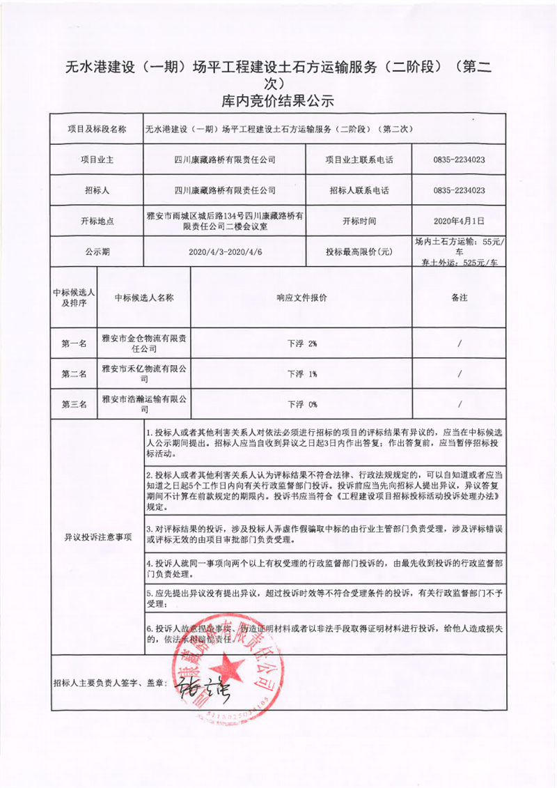 四川康藏路橋有限責(zé)任公司無水港建設(shè)(一期)場平工程土石方運輸服務(wù)(二階段)(第二次)庫內(nèi)競價結(jié)果公示