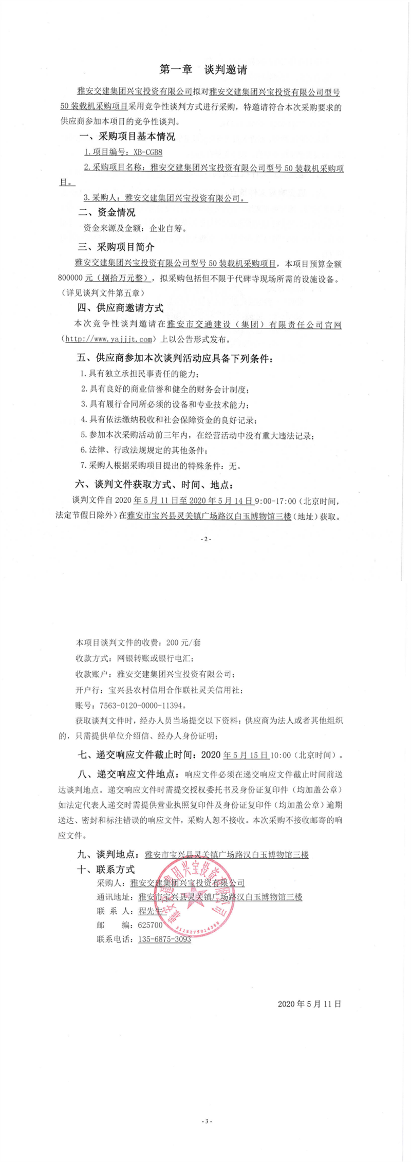 雅安交建集團(tuán)興寶投資有限公司型號50裝載機(jī)采購項(xiàng)目競爭性談判公告