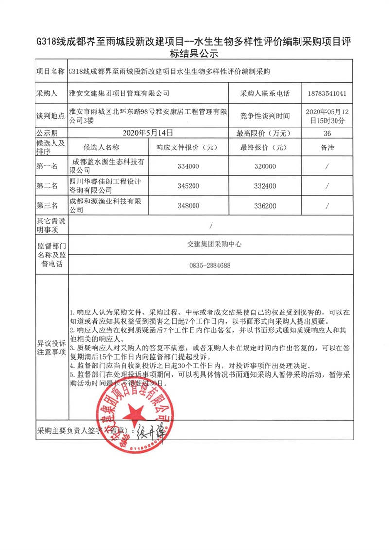 雅安交建集團(tuán)項目管理有限公司G318線成都界至雨城段新改建項目水生生物多樣性評價編制采購項目評標(biāo)結(jié)果公示