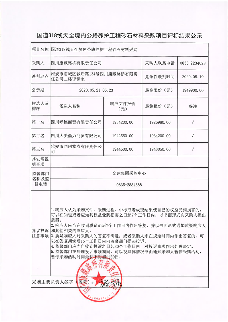 四川康藏路橋有限責(zé)任公司國道318線天全境內(nèi)公路養(yǎng)護工程砂石材料采購項目評標結(jié)果公示