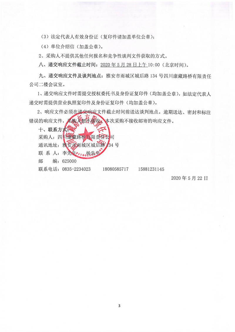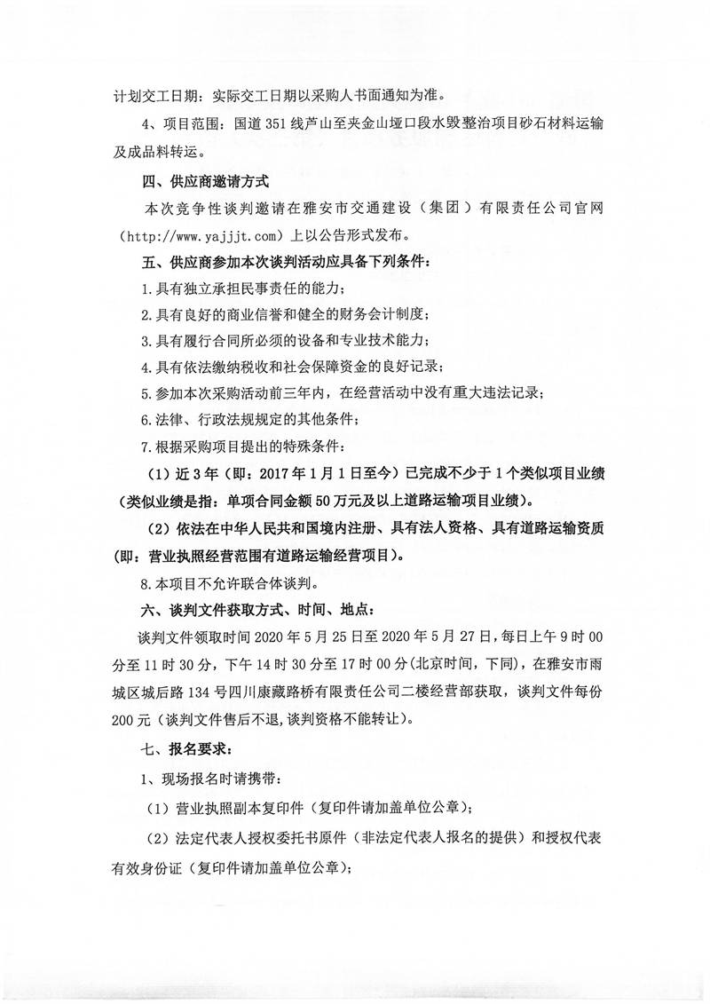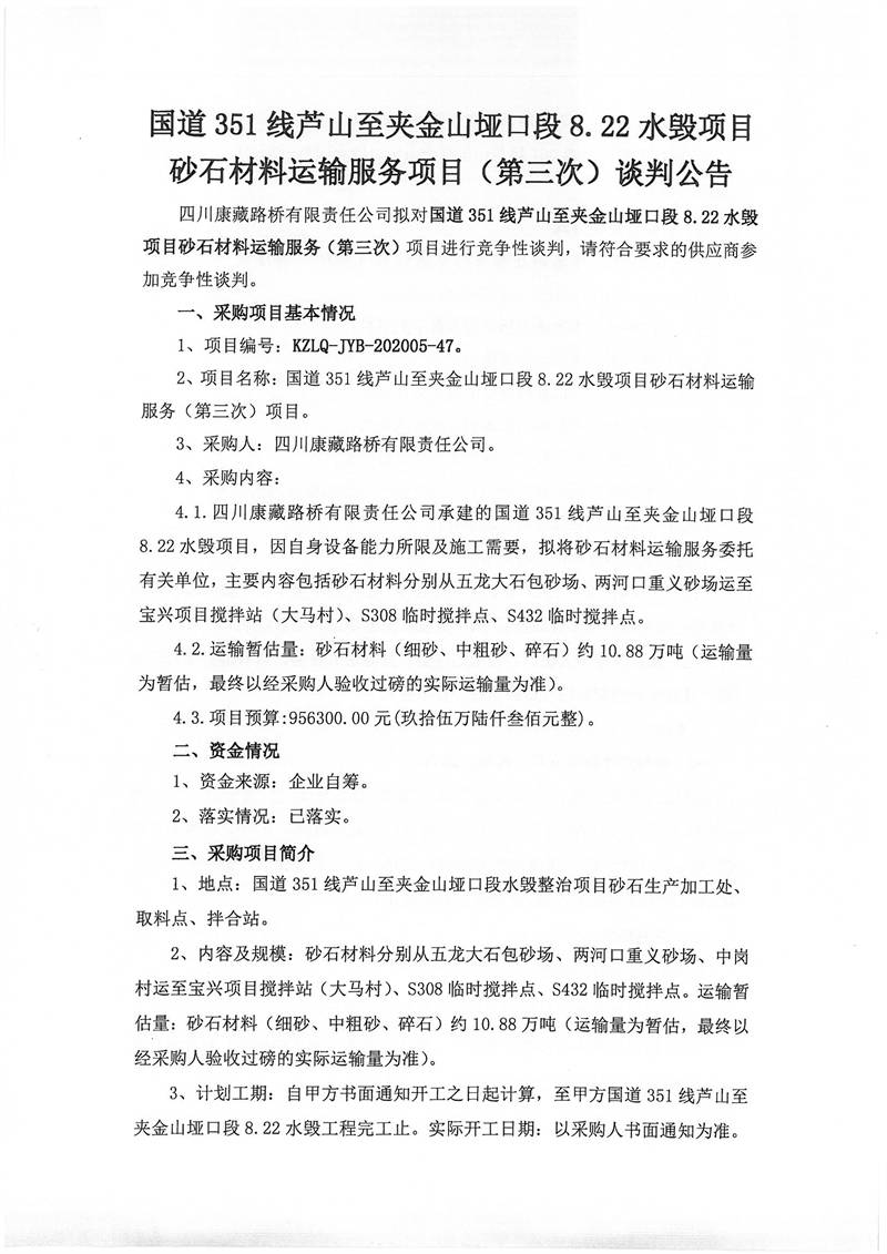 四川康藏路橋有限責任公司國道351線蘆山至夾金山埡口段8.22水毀項目砂石材料運輸服務項目(第三次)談判公告