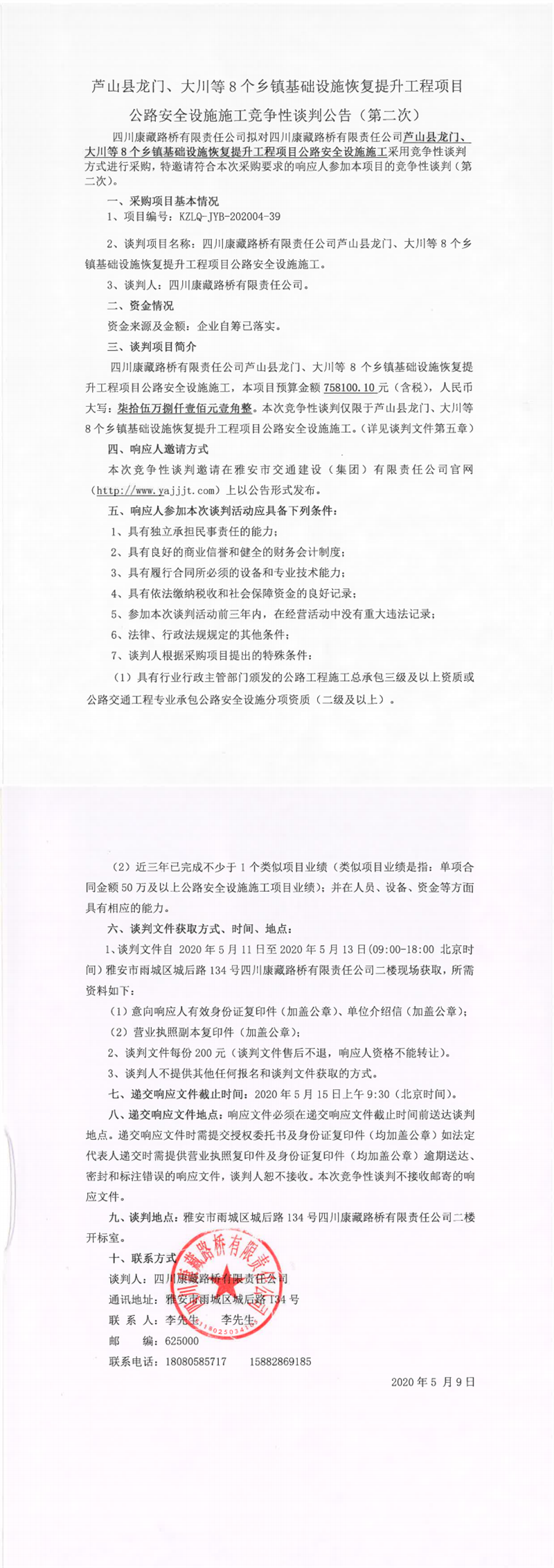 四川康藏路橋有限責任公司蘆山縣龍門、大川等8個鄉(xiāng)鎮(zhèn)基礎(chǔ)設(shè)施恢復(fù)提升工程項目公路安全設(shè)施施工競爭性談判公告(第二次)