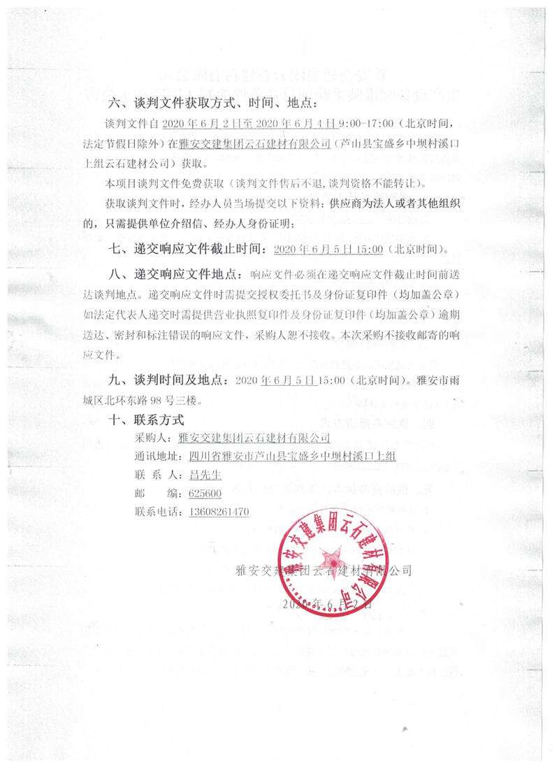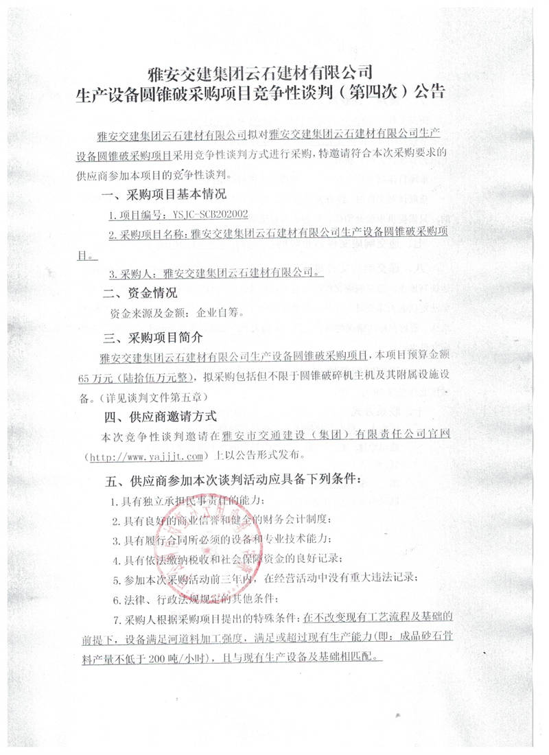 雅安交建集團云石建材有限公司生產(chǎn)設(shè)備圓錐破采購項目競爭性談判(第四次)公告