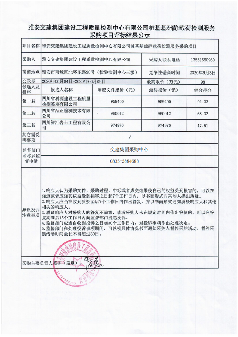 雅安交建集團建設工程質量檢測中心有限公司樁基基礎靜載荷檢測服務采購項目評標結果公示
