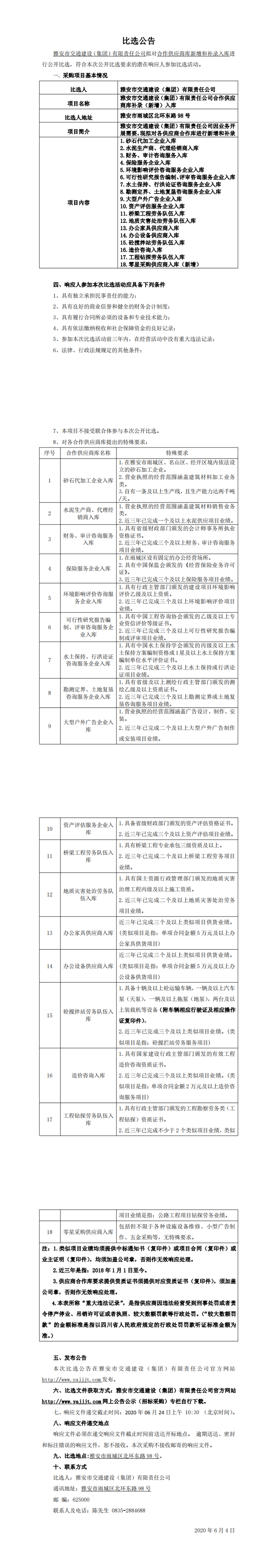 雅安市交通建設(shè)(集團)有限責(zé)任公司合作供應(yīng)商庫補錄(新增)入庫比選公告