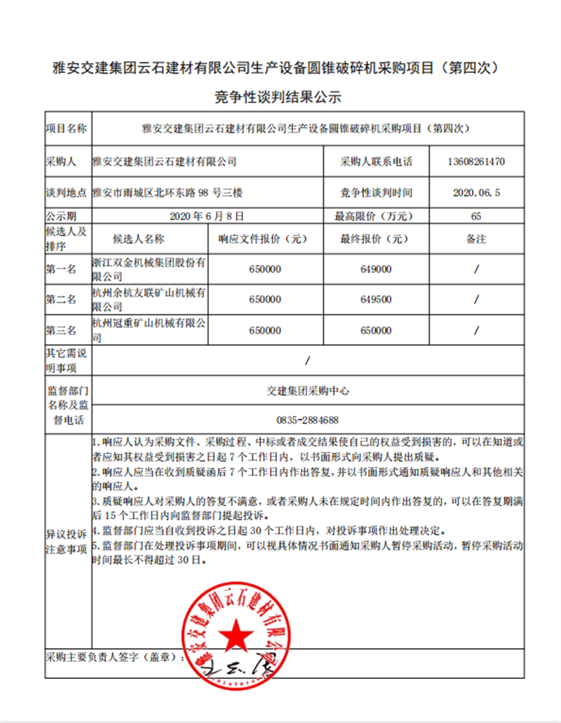 雅安交建集團(tuán)云石建材有限公司生產(chǎn)設(shè)備圓錐破碎機(jī)采購項(xiàng)目(第四次)競(jìng)爭(zhēng)性談判結(jié)果公示