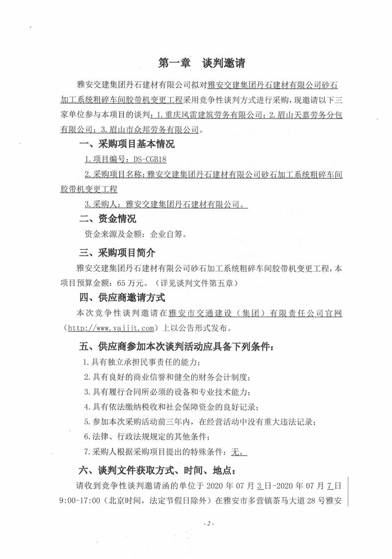雅安交建集團(tuán)丹石建材有限公司砂石加工系統(tǒng)粗碎車(chē)間膠帶機(jī)變更工程競(jìng)爭(zhēng)性談判邀請(qǐng)公告
