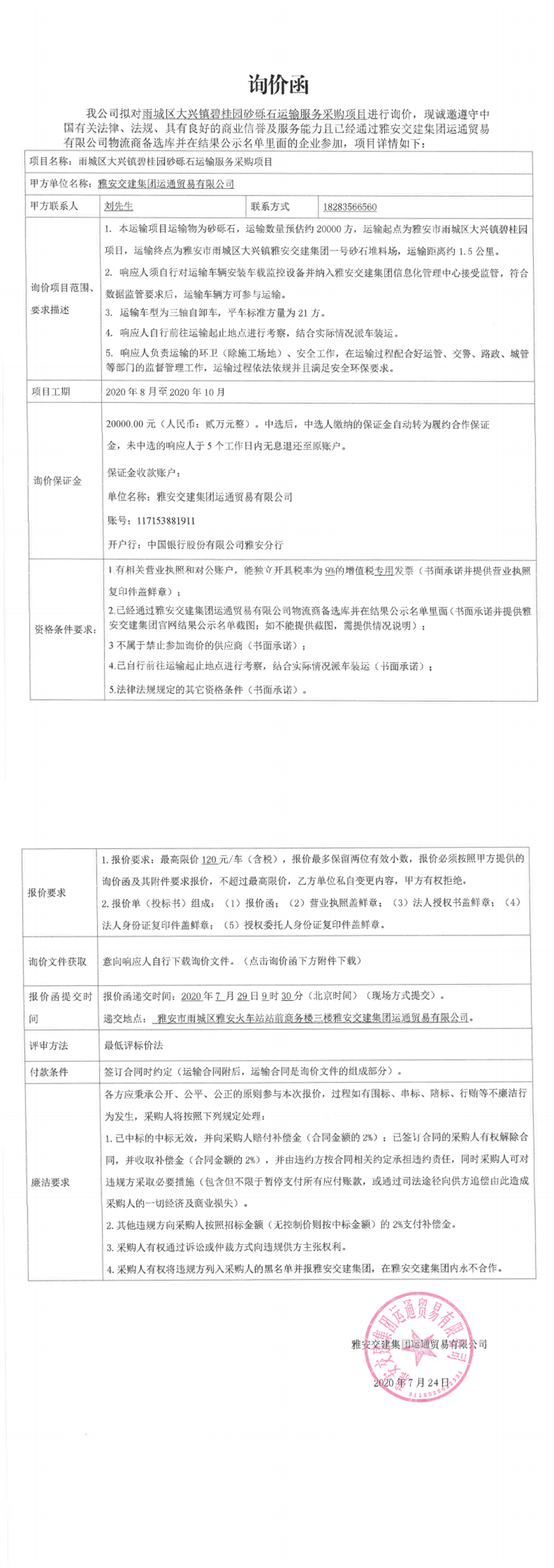 雅安交建集團(tuán)運(yùn)通貿(mào)易有限公司雨城區(qū)大興鎮(zhèn)碧桂園砂礫石運(yùn)輸服務(wù)采購(gòu)項(xiàng)目詢價(jià)函