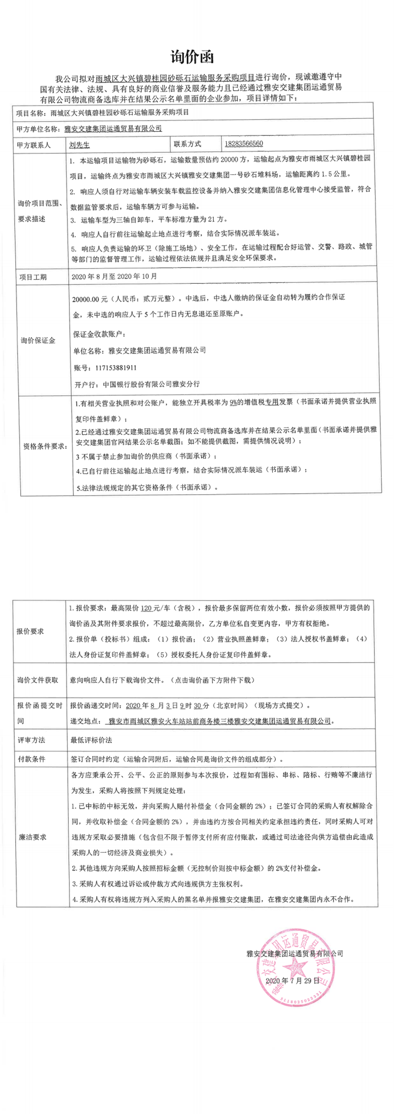 雅安交建集團運通貿(mào)易有限公司雨城區(qū)大興鎮(zhèn)碧桂園砂礫石運輸服務(wù)采購項目(第二次)詢價函